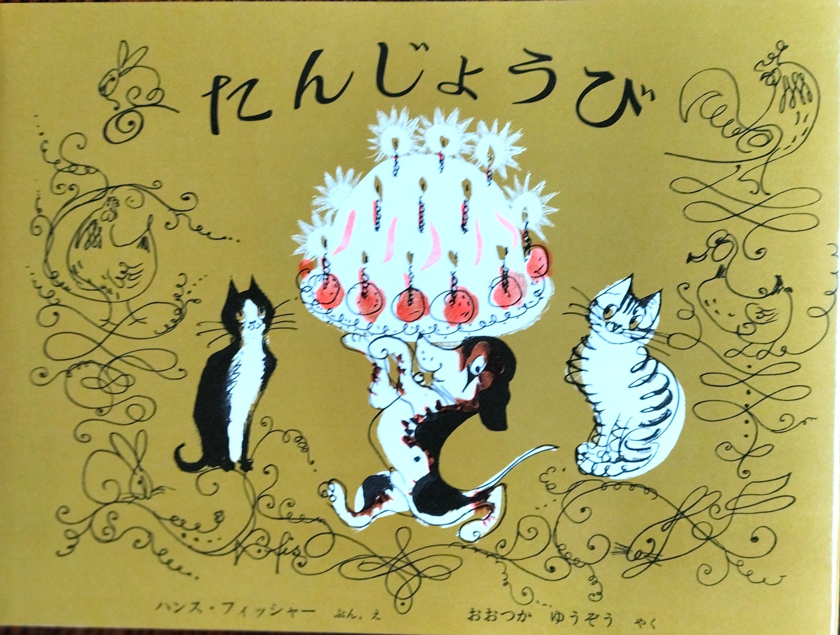 表紙のケーキが美味しそうで、ねこやいぬもかわいくて。他にもめんどりやあひる、うさぎたちが踊っているような美しい線画が楽しい絵本。
